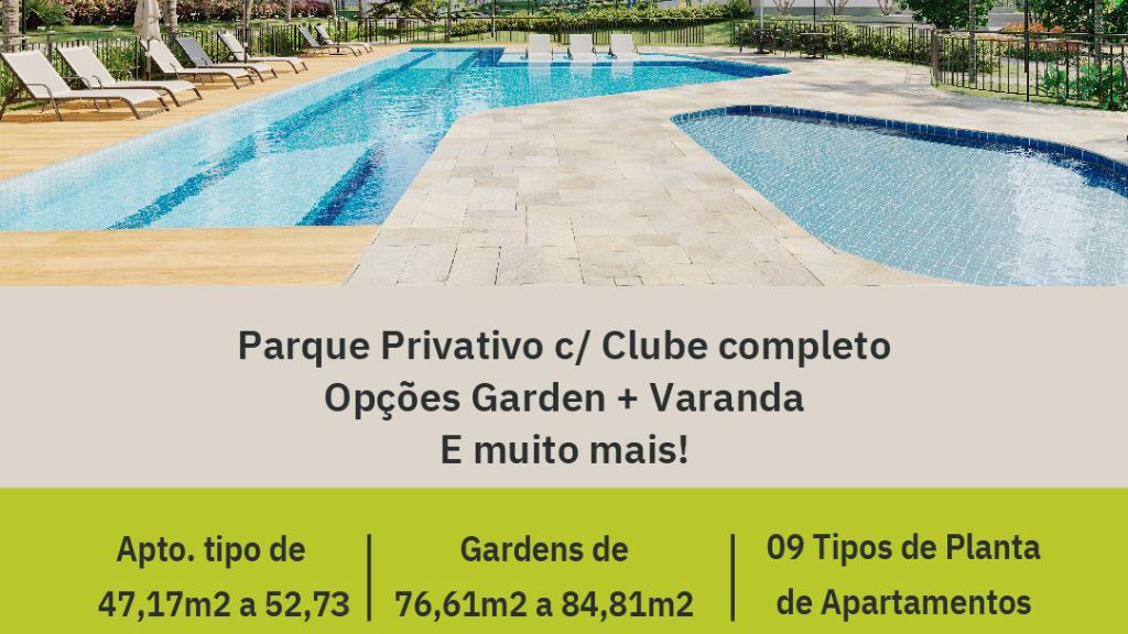✅ Apartamentos tipo de 47,17 m² a 52,73 m² e Gardens de 76,61 m² a 84,81 m²;