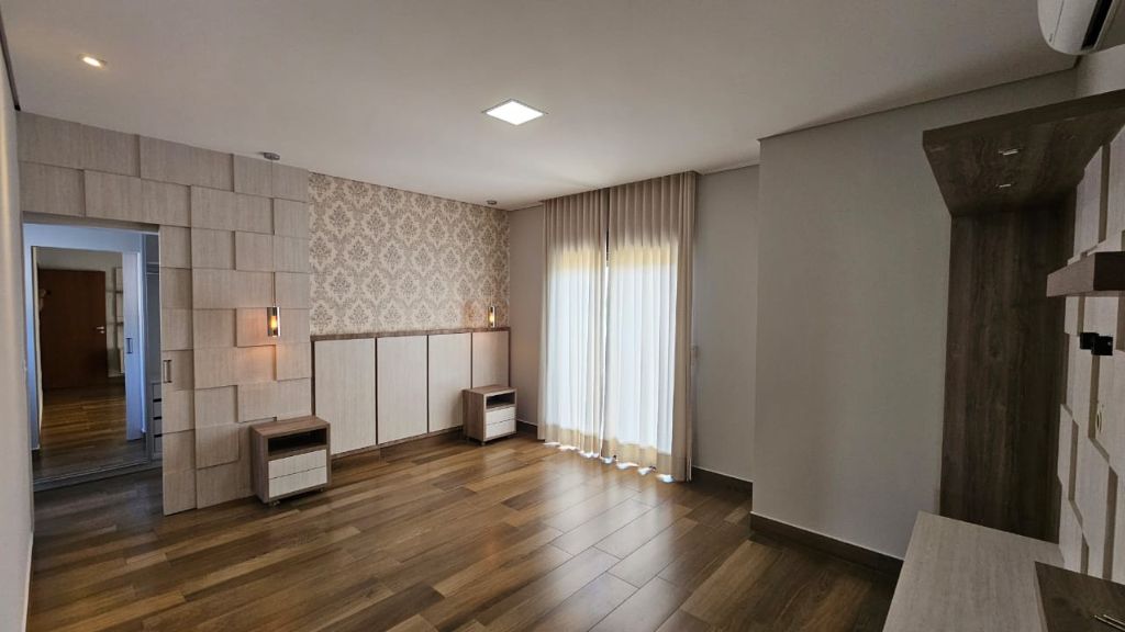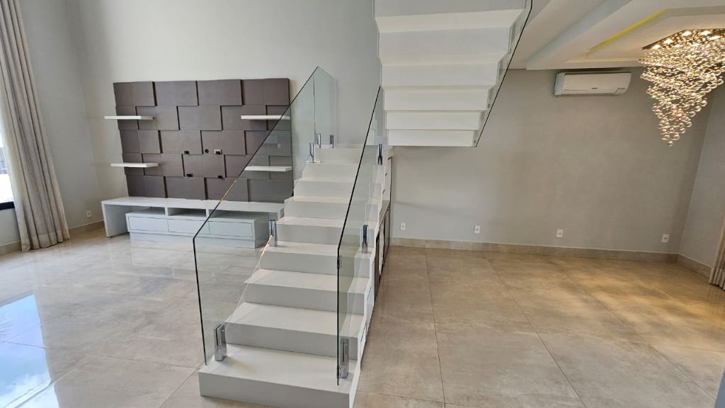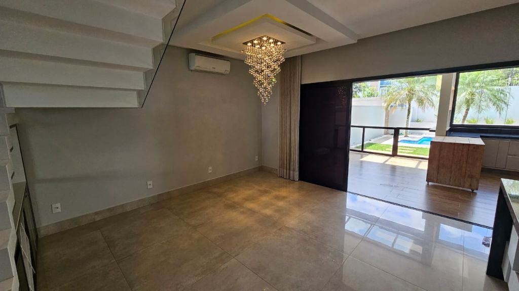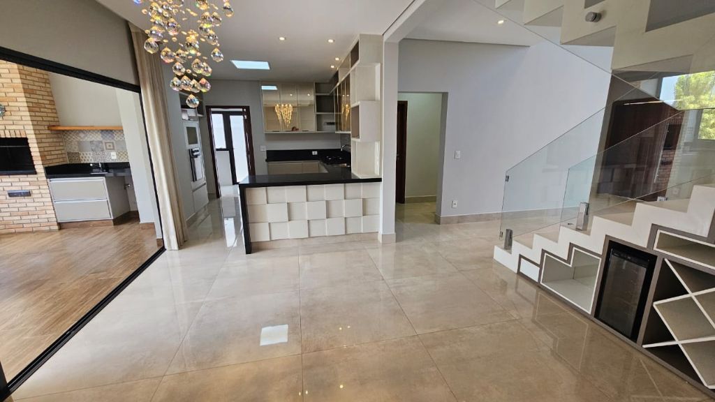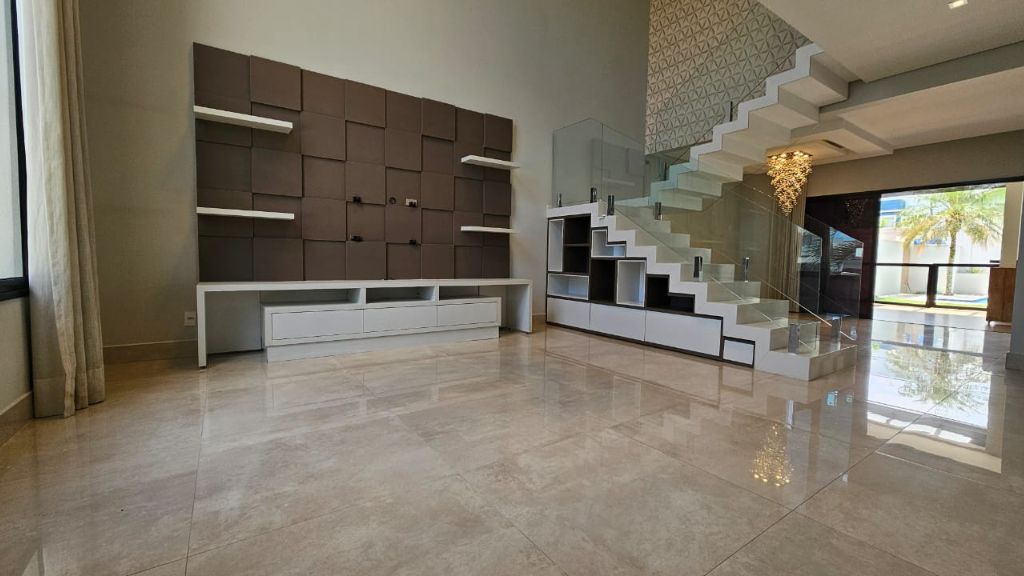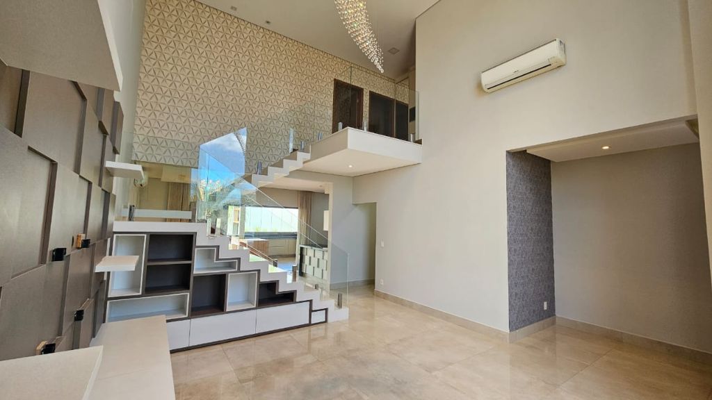 - Sala ampla com pé direito duplo, móveis planejados e lustre de cristal,