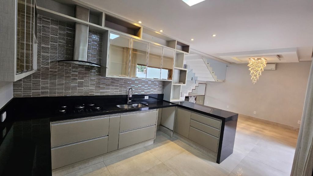 - Cozinha planejada com península, cooktop, coifa e forno elétrico,