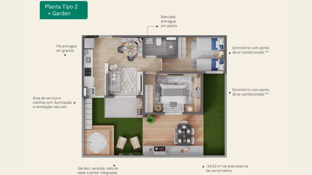 ✔️ Metragem Interna: 46,25 m² + 34,02 m² de área externa.